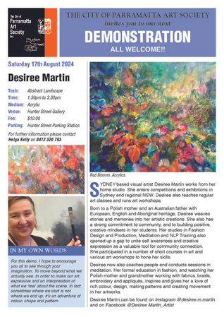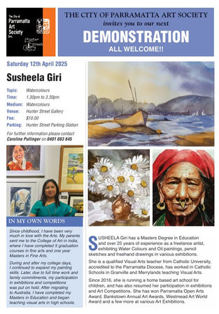 The Parramatta Art Society offers regular demonstrations by local artists in a range of subjects and media.